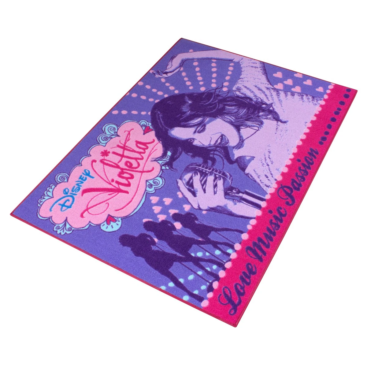 Sie ist der neue Disney-Star! Die Sängerin Violetta ist bekannt für ihregroßen Auftritte und die Liebe zur Musik. Mit diesem Teppich im Violetta Design €žLove Music Passion€œ wird das eigene Zimmer zum €žStudio 21€œ – einem Ort für Tanz- und Musikeinlagen, denen dank des rutschhemmenden, für Trittfestigkeit sorgenden Teppichrückens keine Grenzen gesetzt sind. Mit mädchenhaften Farbkombinationen aus Pink- und Lilatönen und verspielten Motive setzt der 95x133cm große und pflegeleichte Teppich einen farblichen Akzent im Kinder- und Jugendzimmer und schafft eine positive Atmosphäre zum Wohlfühlen.