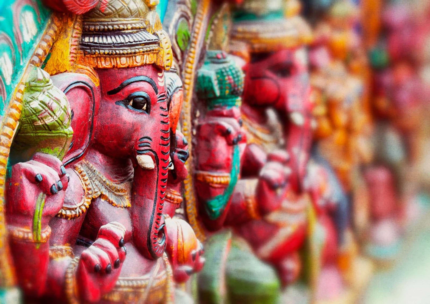 Diese Tapete aus der Kollektion Indian Style von Rasch nimmt dich mit auf eine Reise nach Indien. Inspiriert von prachtvollen Palastgärten und kunstvollen Grafiken bringen dir die Tapeten der Kollektion orientalisches Flair nach Hause. Die Fototapete 363487 zeigt den indischen Gott Ganesha, der aussieht wie ein Elefant in Pink-, Orange- und Grüntönen. Entdecke auch die weiteren Tapeten dieser Vliestapetenkollektion bei uns im Shop.
