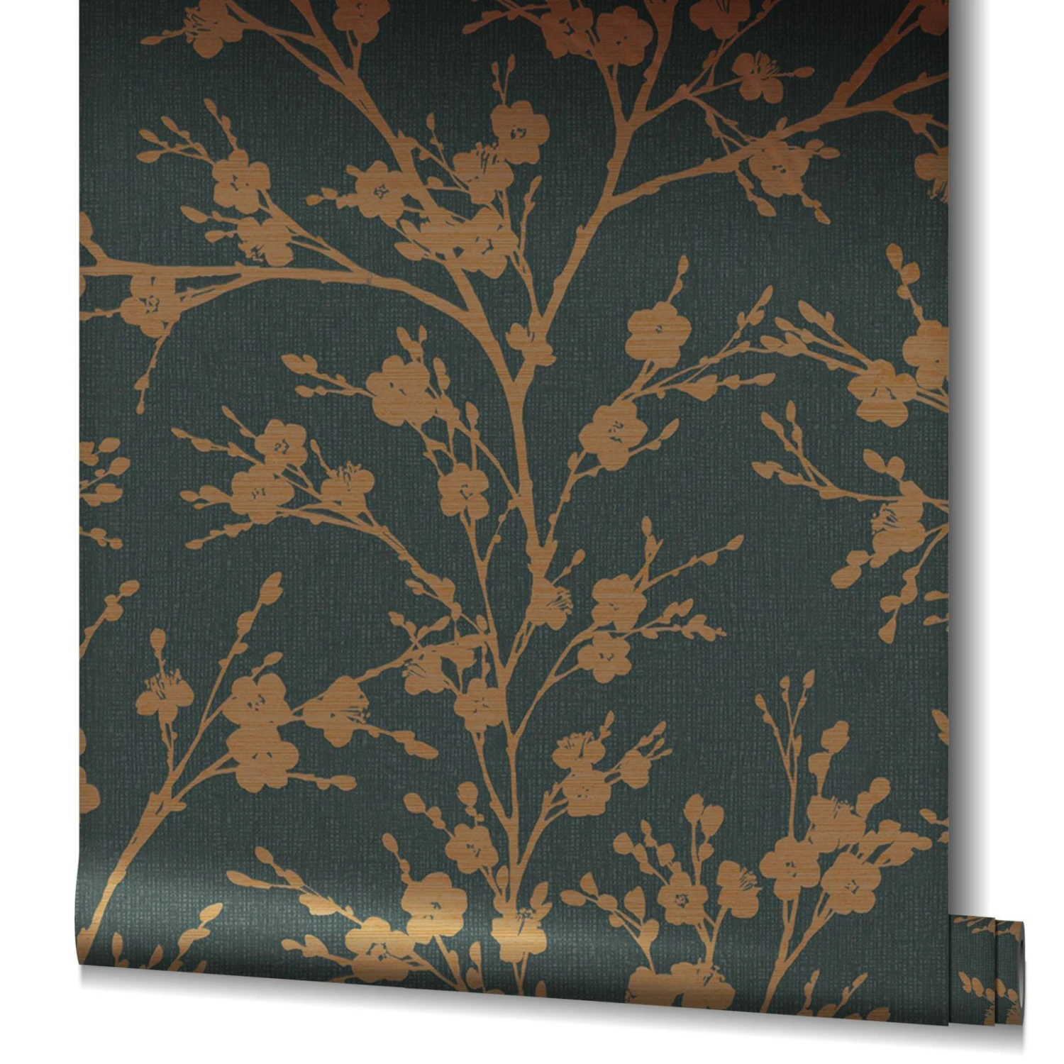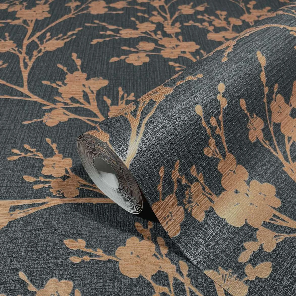 Vliestapete 6812-50 aus der Kollektion Ivy von Novamur mit Kirschblütenmotiv in schwarz mit metallic Effekt in Gold